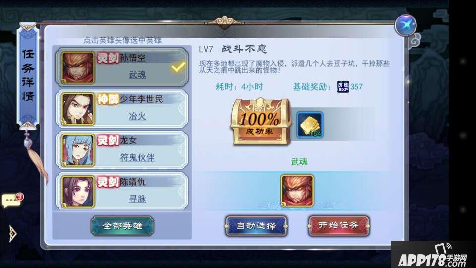 也称符鬼食物任务。有没有发现给符鬼跑吃的任务里英雄都是有专长的,而且每个任务都有属性,用对应的专长英雄去跑对应的属性任务成功率会大幅度提高。单人任务100%成功率,双人任务95%成功率。比如孙悟空的武魂属性跑武魂属性的任务,成功率100%。如下图: