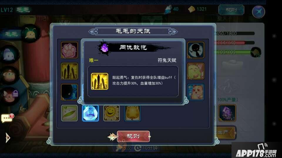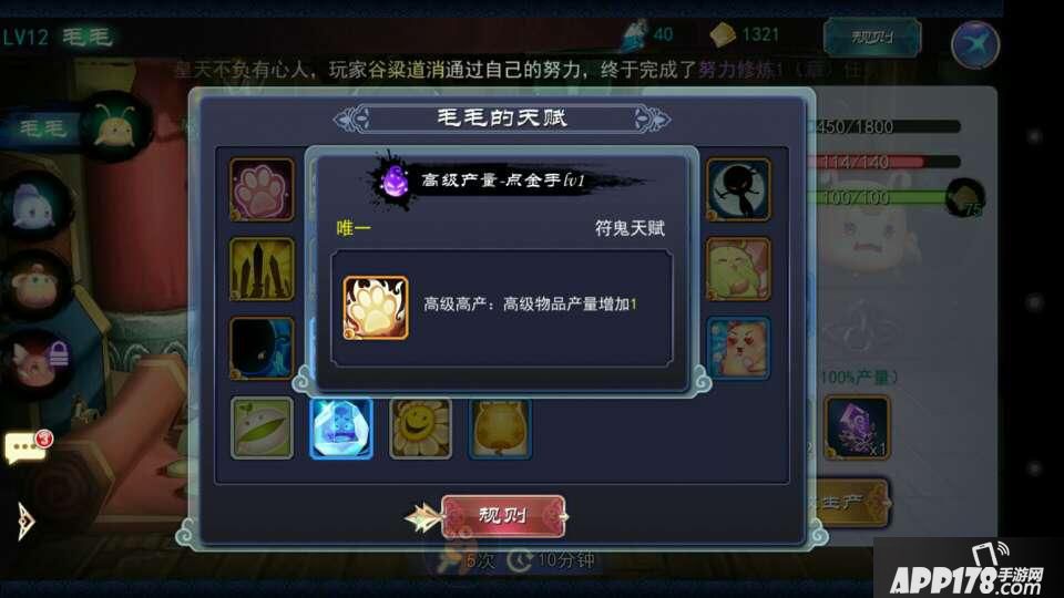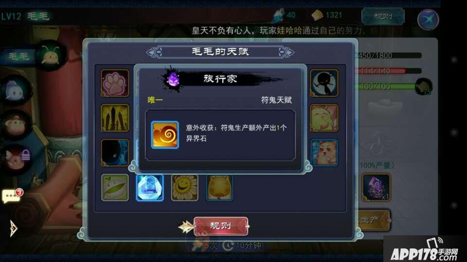 符鬼最重要的部分那就是天赋,只有好的天赋才能玩出高质量的游戏。目前发现符鬼在升级到10级后会增加一个天赋,这对生产的重要性不言而喻。个人发现有三个天赋非常不错。一个是旅行家,增加一块异界石产量,可以保证每天秘境寻宝不愁没异界石了。一个人体力药水,有了体力药水就能把生产费的体力赚回来了。再就是高级产物点金手,增加高级产物产量,可谓可遇不可求的好天赋。
