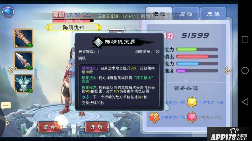 看到没,技能说明里有个冰冻:下一个敌方行动单位冰冻1秒的功能,没错,这就是打断技能,在程咬金、黑龙王还有龙女BOSS放大招的时候,及时让陈靖仇变身就能打断BOSS释放技能,当然悠悠们要控制好陈靖仇的灵气值同时变身留给他。只要能打断一次,在硬件差不多的情况下都能通关哦!