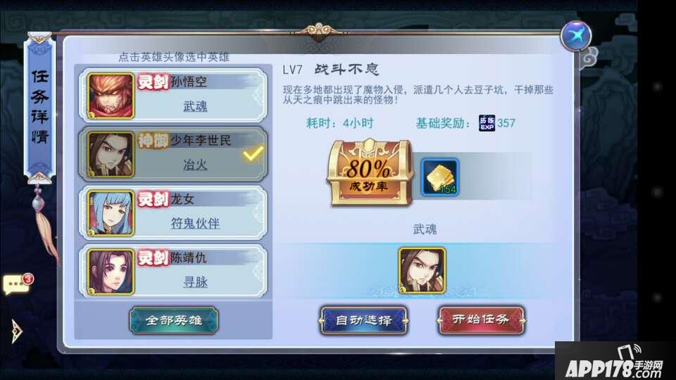 反之成功率就没那么高了。比如用李世民的冶火属性去跑武魂的任务只有80%的成功率。如下图:
