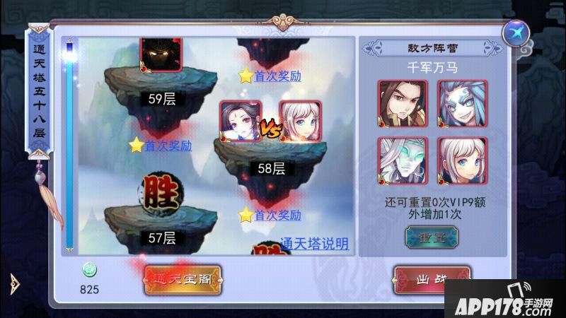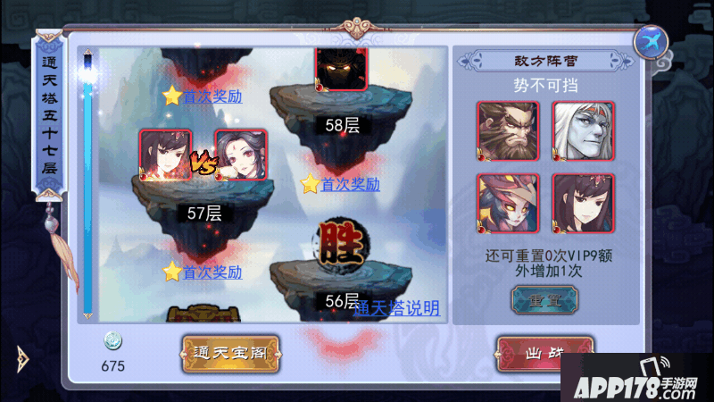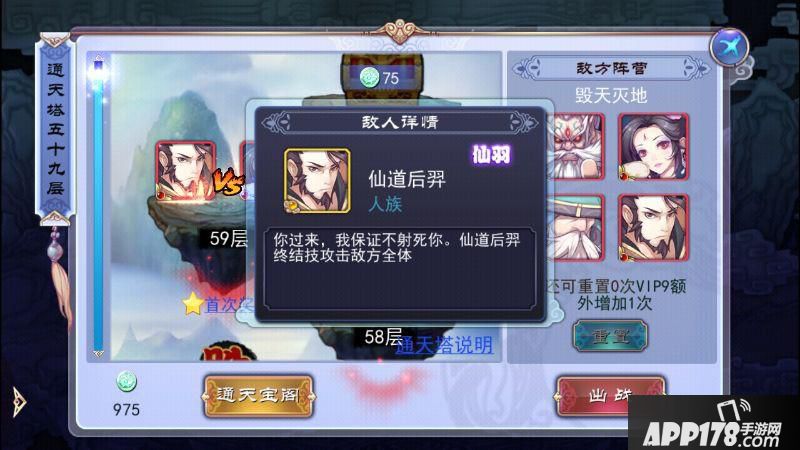 恭喜你,来到了59层,塔顶已经离你不远了。这一关为新版梦之队,其实我更愿意叫他伪-梦之队,更46以后那个队伍完全不在一个档次。这一关除了大招攻击超级高,雨师的雷很烦人以外,几乎没什么难度。所以,只要顶掉两个大招,打断后羿大招,那么基本上,你已经站在塔顶了。英雄配置:托塔(天将),宁珂(没有可换其他AOE英雄),雨师(同理可换其他AOE英雄),嫦娥(可换古月,如果两个都有,那么基本过关无悬念了,直接上双打断加AOE)。进场后,宁珂,雨师开大,此时托塔能量不可能满星(有判官的可以试验下,看能不能拖到),只能变身抵消两个大招(如果有雨师,导致两人没在同一时间开大,后排有一人被电没有护盾时,可用嫦娥先打断,看能否在后羿开大之前攒满一颗星),接下来嫦娥打断后羿,之后重复这个步骤即可,最后注意要打断盘古变身。如果到这里,恭喜你,塔顶已经在跟你招手了。