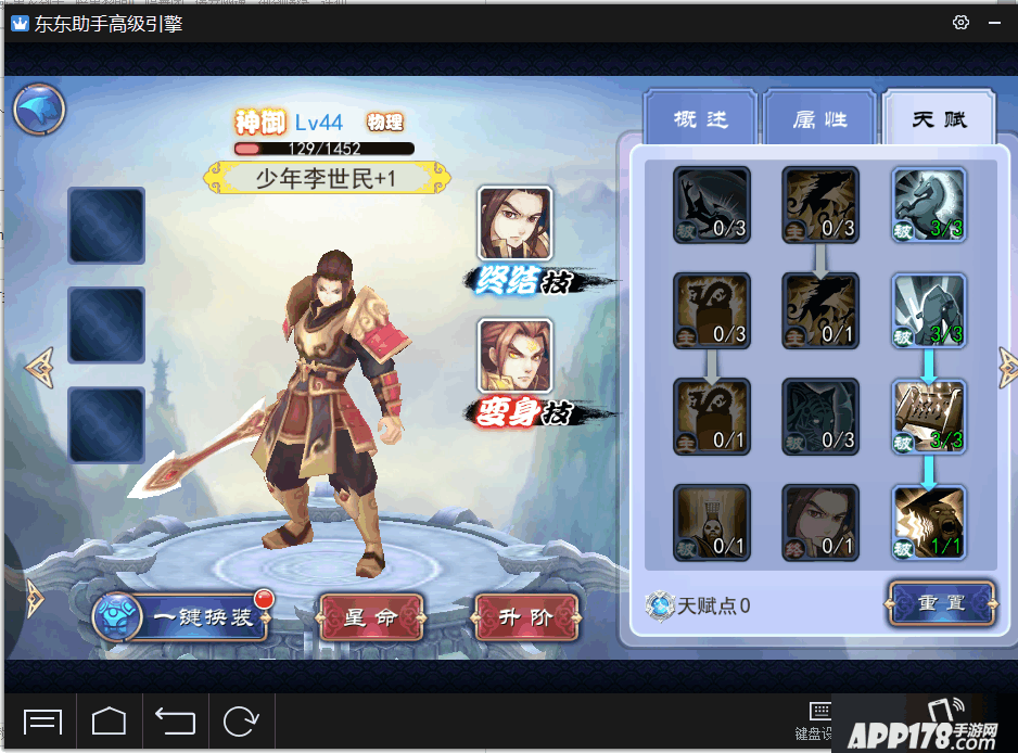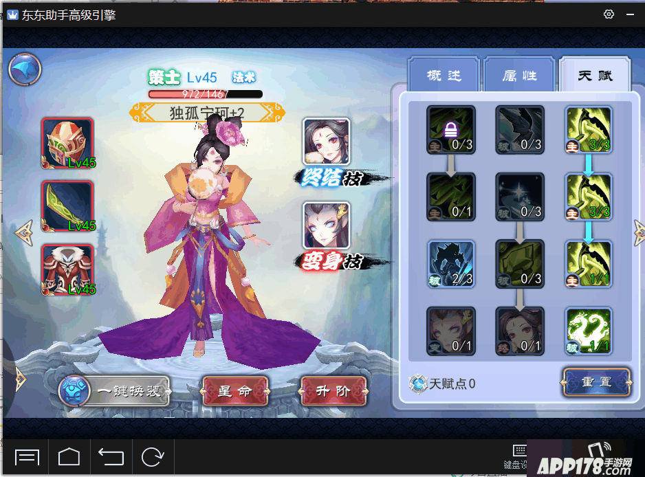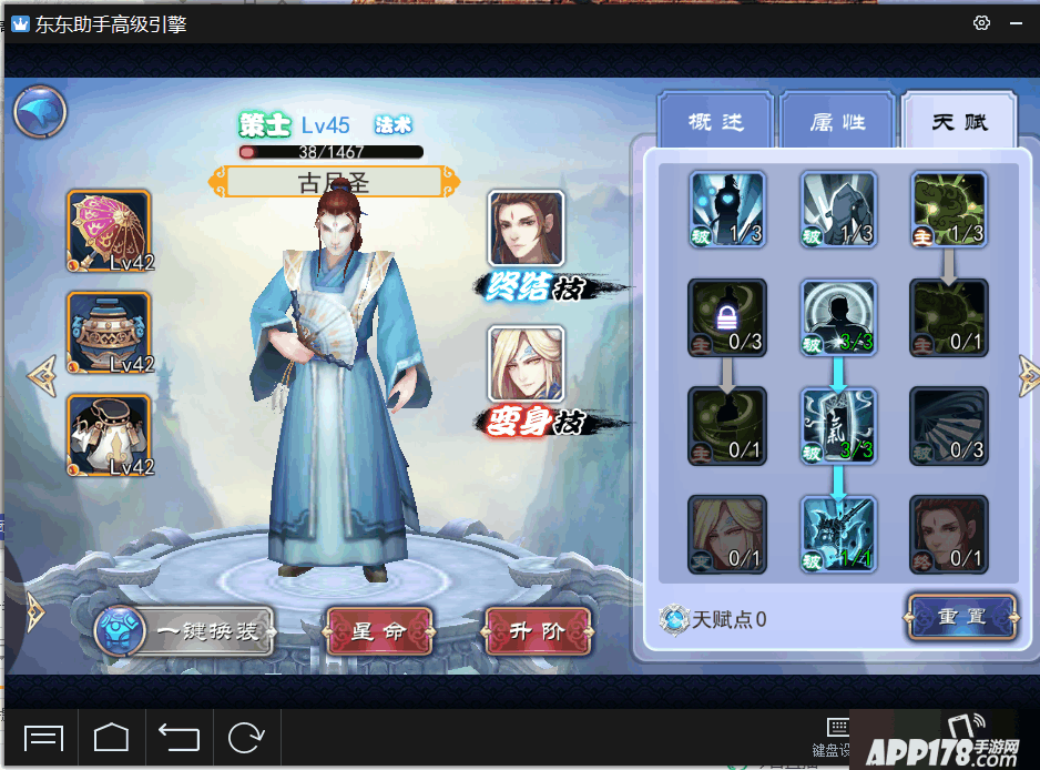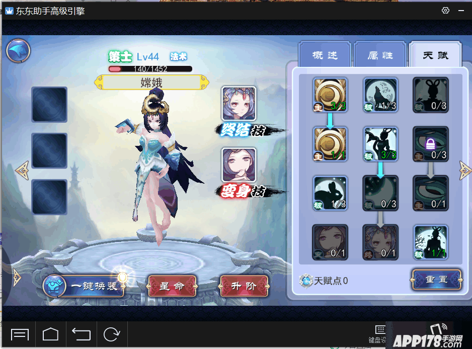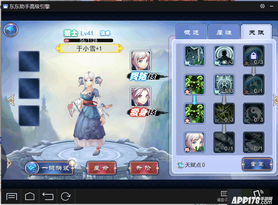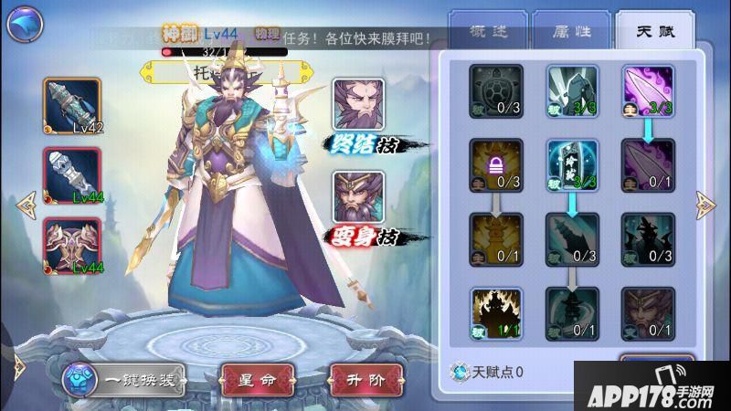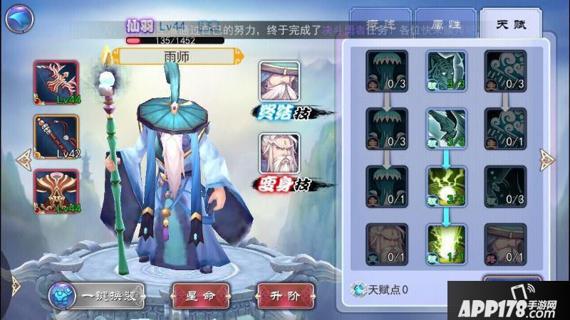 首先,说下英雄及神器配置。神御:托塔(天将也行)。灵剑(没鸟用或者说起码我这里没用)。仙羽:雨师(娥皇,宇文,后羿,在有些时候可以替代。或许有人说黑无常好,但是此篇为极限攻略带他在极限情况下,依旧打不过)。策士:宁珂,嫦娥(没有宁珂可用小雪、古月比嫦娥更好。)神器:三阶伏羲琴(二阶。。别说你都爬到50层了还没一个三阶伏羲琴?)附上天赋截图: