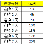 【活动内容】:活动期间,连续充值元宝会获得相应元宝返利,连续充值天数越多返利就越多,机会非常难得!如中断连续充值,则按所充连续天数返还比例结算(如连续充值3天返利7%),返利元宝在活动结束后以系统邮件形式发送。