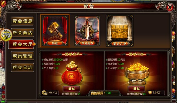 捐献金币:每次捐献10万金币获得10点帮贡,最多捐15次,消耗150万金币得150点。