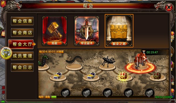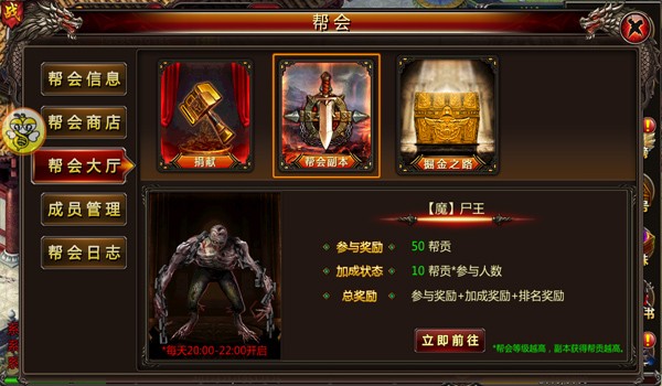 帮会副本副本在每天20点-22点开启,参加1次会得50帮贡左右,都是帮会成员一同去战斗,大家一起努力一下就把BOSS给打趴。