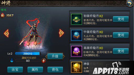 选中升级按钮,使用经验丹就可以给神将升级了。