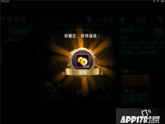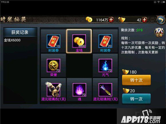 20元宝抽一次,十连180元宝,获奖记录在左边有显示。