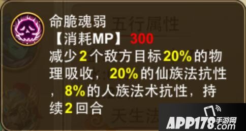 技能一:命催魂弱,减少2个敌方目标20%的物理吸收,20%的仙族法抗性,8%的人族法术抗性,持续2回合。