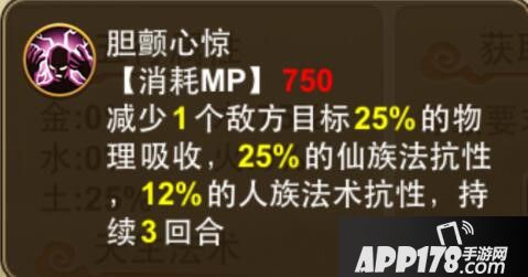 技能二:胆颤心惊,减少1个敌方目标25%的物理吸收,25%的仙族法抗性,12%的人族法术抗性,持续3回合。