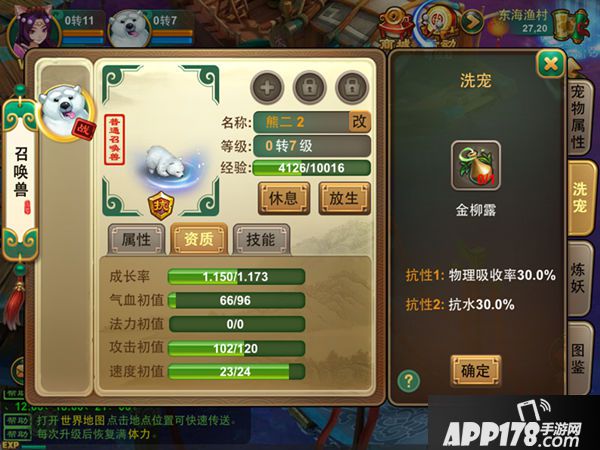 获得召唤兽以后,玩家可以查看召唤兽的天生资质。而召唤兽的成长率与四项初值,会一直影响召唤兽往后的提升。如果,玩家不满意召唤兽的天生资质,可以使用“金柳露”重洗宠物的资质。