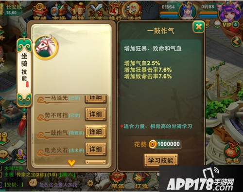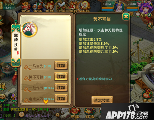 力量高的坐骑可以选择“势不可挡”或者“一鼓作气”;也可以选择铺助技能“固若金汤”。小伙伴们可以根据自身所需,学习自己心仪的技能。