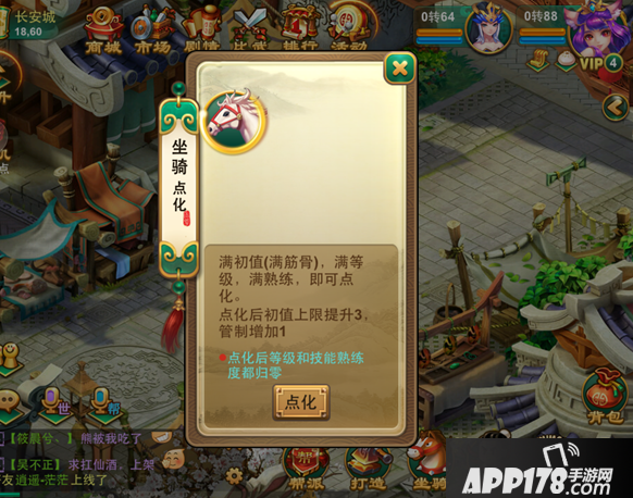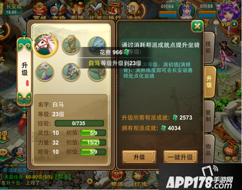 对坐骑使用道具:坐骑提气丸(能增加坐骑的初值各1点。)商城、活动均能获取。