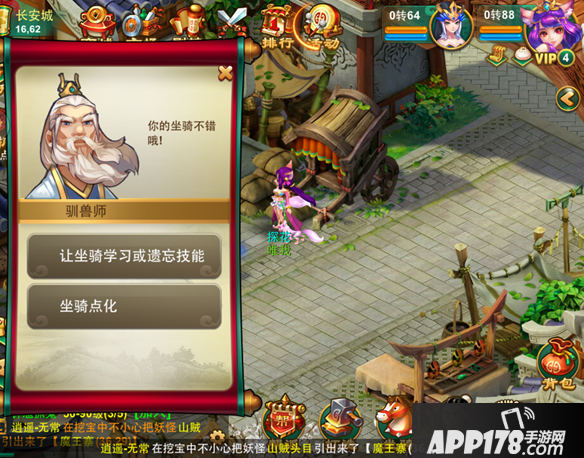 当你获得坐骑后,可以去长安城找“驯兽师”,让自己的坐骑学会另一种技能,增加坐骑能力;