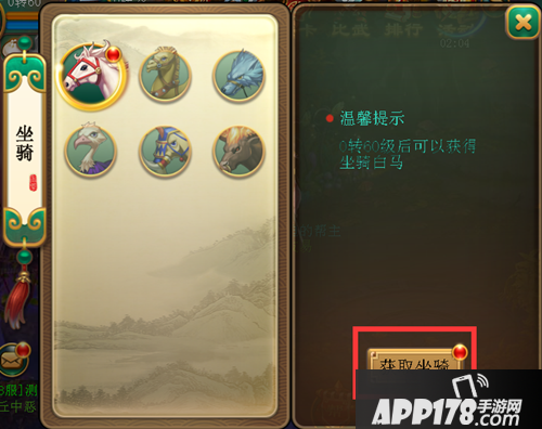 点击“获取坐骑”,将会获得你第一个坐骑。当到达了对应等级后,就可以免费获取到更高级的坐骑。