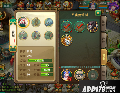 选择坐骑,通过“管制”,选择当前出战的召唤兽,每场战斗结束后(非玩家之间的战斗),坐骑将会获得一定的经验值。当经验值满后,会自动升级。坐骑等级上限为100级;