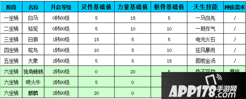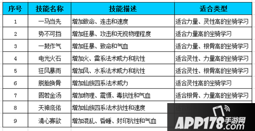 坐骑种类及天生技能,见下图: