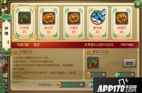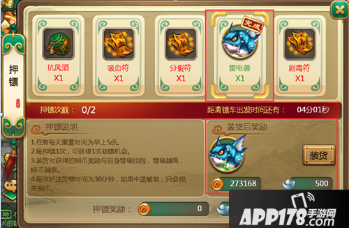 当背包中有任务所需要的物资时,该道具就会标记 “完成”。此时,在装货后奖励栏中,可以看到该物品的价值。点击【装货】,即可将物品封箱。同时,押镖奖励即可增加铜钱及银币奖励。