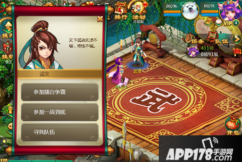 为了能让玩家每逢周一、周四、周六21:00~22:00半个小时的活动时间内,只要玩家的等级到达了60级以后就可以在活动中点击【前往】或直接到长安城擂台的NPC【武官】处进入擂台与其他玩家进行比武。比武是单人进行,小伙伴并不会出战。