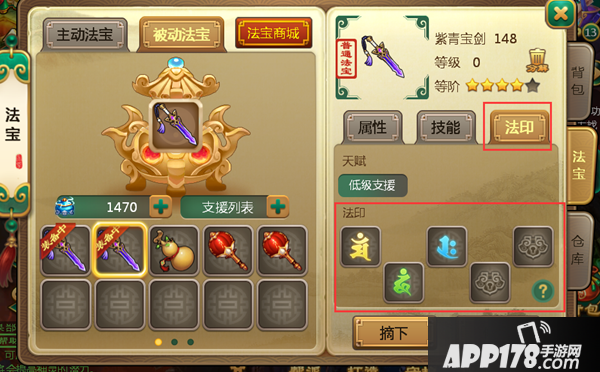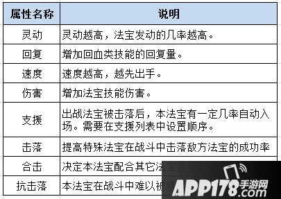 法宝的属性将会影响法宝的威力,例如灵动,灵动越高,当前回合发动的几率越高。如何提高灵动或者其它属性呢,除了提升品阶外,激活法印,也是必要之举。