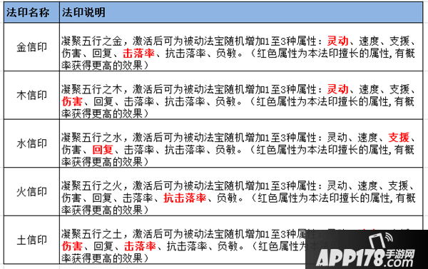 每个法宝可同时激活5种不同的法印,每种法印都有不同的擅长属性。