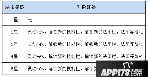 法宝一共有5个等阶(初始为1星),最高为5星。每升星一次,将会自动解锁一个等阶属性,等阶越高,所获得属性越多,如图: