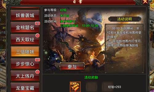 三倍除妖,顾名思义就是在这段时间内,降妖除魔能获得比之前多三倍的奖励。在《西游征途》每日12:00-12:30的奖励暴击时间内,不少仙友都来一场说砍就拿刀杀怪的除魔之旅,上古遗迹内可谓是人满为患。不过万幸地图内怪物数量充足而且刷新极快,所以还是能够满足诸位仙友的除魔欲望滴。不过挂机时除了要注意怪物,还要小心敌方玩家攻击,毕竟上古遗迹内可以允许自由PK的哦!
