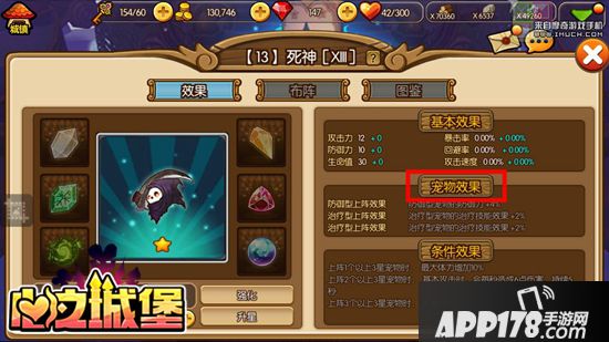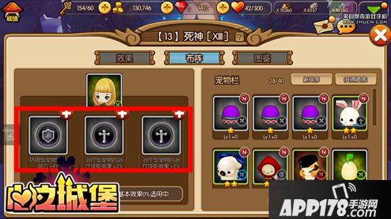 其实阵法不在多少,而在于使用是否得当,而萌宠搭配是否合理就是评价阵法使用是否得当的关键所在。上文提到,《心之城堡》不同的塔罗阵法能为团队提供不同的BUFF效果,这就要求大家在选择上阵宠物的时候三思而行,一定要让宠物的类型与阵法的BUFF类型一致。比如你用的是“死神”这一阵法,可以看到它的“宠物效果”是BUFF防御和治疗的。