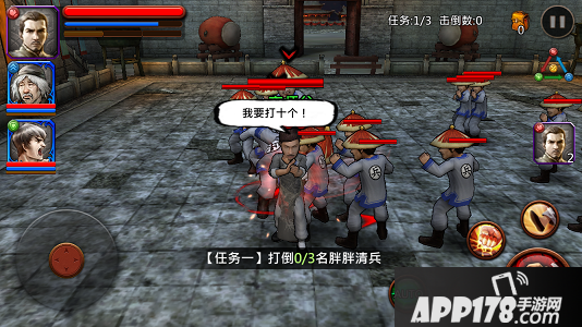 第一个任务打倒3名胖胖清兵,胖胖清兵有击倒技能,记得游走击杀,并用速度型武师积攒怒气!