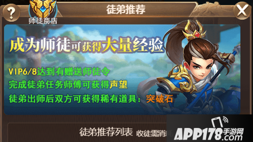 2、师傅篇,玩家等级高了战力高了可以收个小跟班徒弟,每天徒弟做任务你可以收声望可以换奖励,每天给徒弟传功你也能拿到等量的经验,如果徒弟是个妹子,那感觉就不言而喻了。