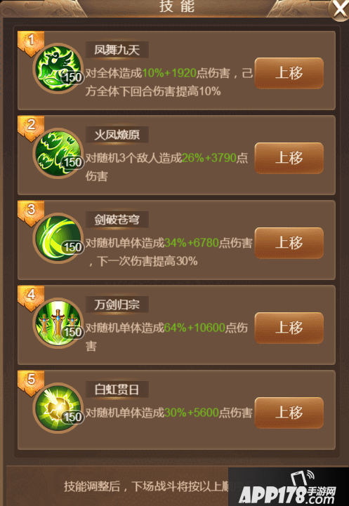1、角色技能摆放,建议第一个摆全体伤害的,第二个摆三个攻击目标的,第三个摆增加下一次伤害的,第四个摆最后那个单体伤害最高的大技能,第五个摆普通攻击。