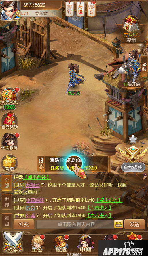 2、进入游戏里面之后呢,先根据任务提示走,例如升几下武将,熔一次装备总之先升到20级,主城有些奖励可以领取,同时也能看到当天的活动奖励,玩家可以根据自身条件适当的充值。