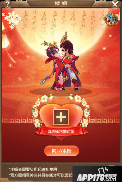 55级开启婚姻系统,两人热恋中进行结婚,双方需要达到等级要求,双方需要互相关注并且在线才能进行结婚。婚礼档次可选简朴、豪华、帝王、觉得婚后房屋属性条数不同。求婚者需要负责起聘礼费用。