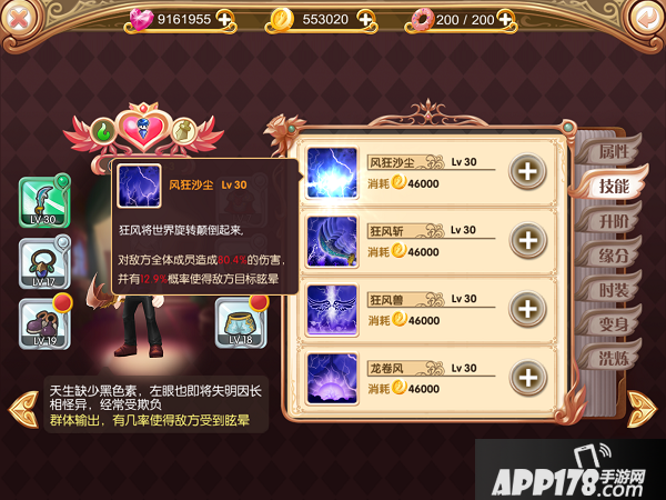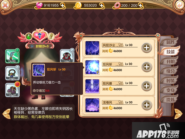 技能是战斗的核心之一,在角色界面里选择技能标签可以进入技能面板,不同的人物职业定位不同,分为攻击(剑)、防御(盾)、辅助(伞)、治疗(心)等。