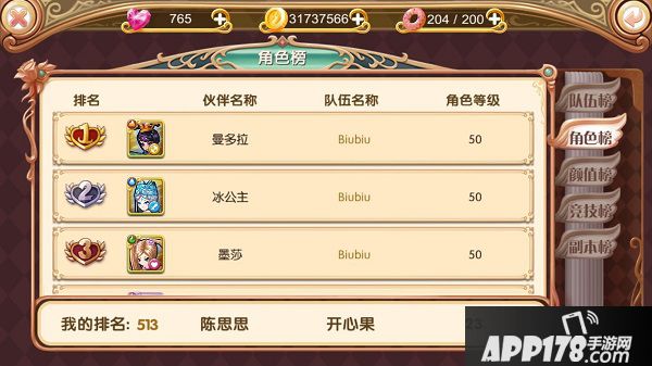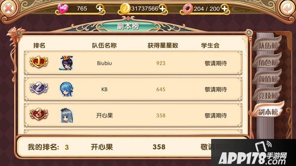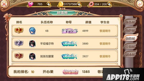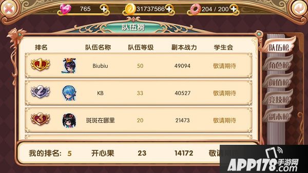排行榜可以点击主界面左侧的【排行】按钮进入,分为队伍榜,角色榜,颜值榜,竞技榜,副本榜五个排行。