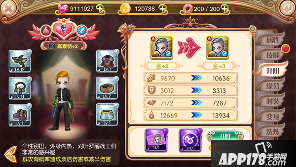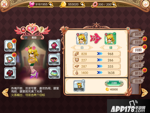 界面内显示升至下一阶后属性变化情况,以及显示升阶所需消耗。