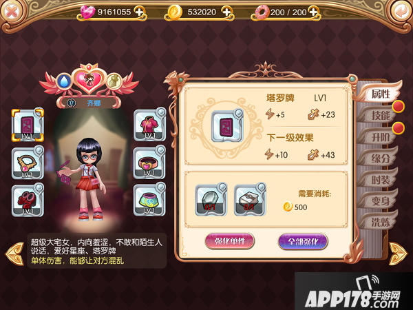 界面右侧上方显示该件装备强化到下一级后的属性,下方则有强化单件与全部强化的选项,不同部位提高的属性各异。