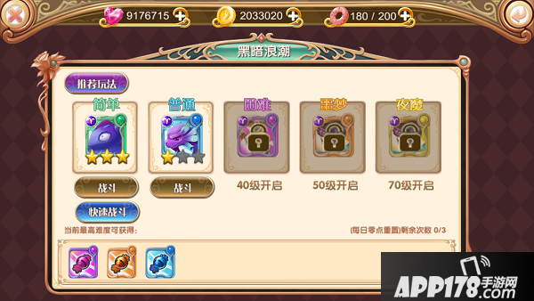 黑暗浪潮15级开启,每日0点重置,每天可打三次,如果通关3颗星就可以选择快速战斗,略过战斗过程为你节省更多时间。