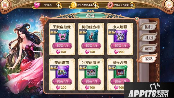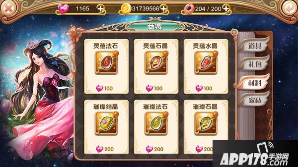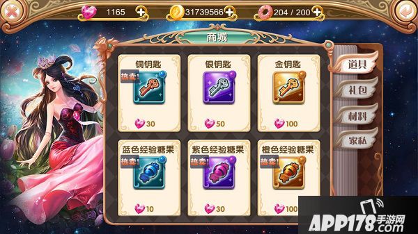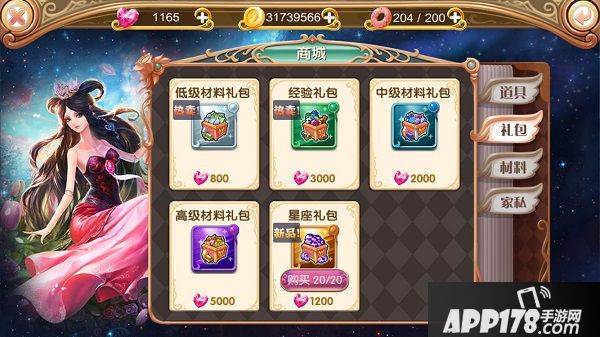 点击主界面左侧【商城】按钮进入商店界面,商店为道具、礼包、材料、家私四类。