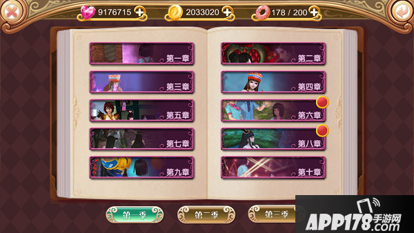 副本为关卡类设置,目前副本主要分为三季内容,每季十章,每章十关。点击左上角的【选章】按钮,可以自行选择章节;