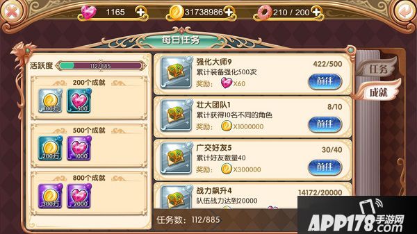 界面右侧可点击【成就】标签进入,完成成就可获得大量金币与钻石,心动不如行动