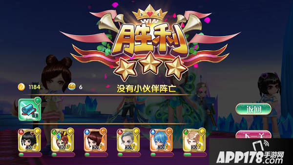 战斗结束后显示星级与获得材料、碎片等,阵容内角色获得经验的情况也在下方展示。