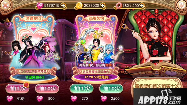 点击主界面右侧【契约】按钮即可进入神奇的契约界面,通过契约可以获得角色、家私、材料等道具,分为普通与高级模式,每个模式分别有抽一次与抽十次的选择,皆需消耗钻石。