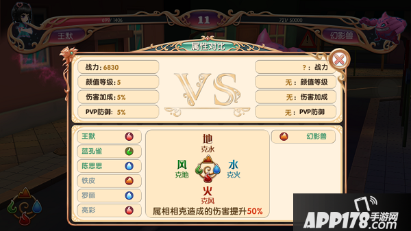 战斗模式里左右上角显示双方当前出招角色,左下角按钮为【属性对比】,你可以根据所显示的属性相克在战斗前更改配置;