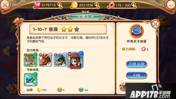 点击关卡点可进行【扫荡】、【扫荡十次】、【战斗】选项操作,界面显示每关可获得的材料、经验、金币、敌人等信息。