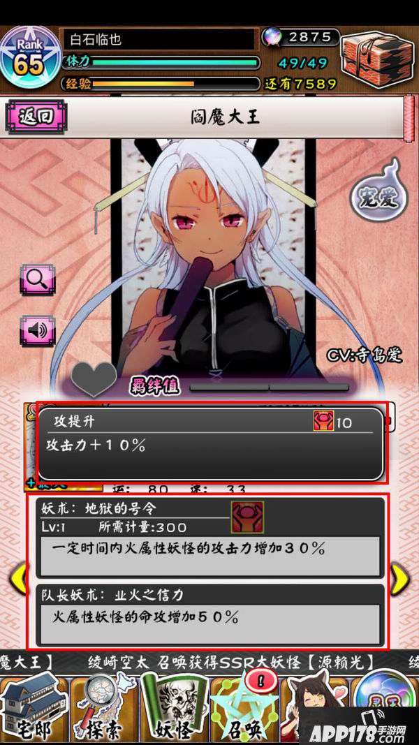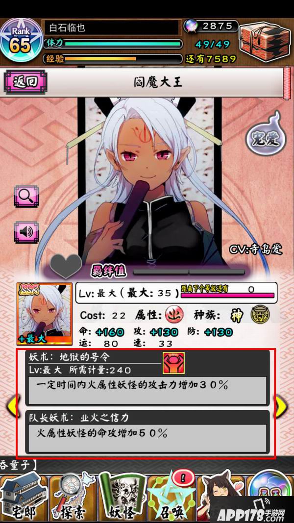 在妖怪的状态中,可以看到妖术的名称、效果、与等级,妖术Lv最大为Lv5。旁边还有个小图示,点一下小图示可以看到妖术的强化效果,而这效果称为有顶天。