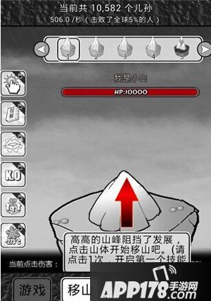 疯狂点击中间的繁殖基地,支持多点触控,所以双手疯狂点击或者叫上好友一起疯狂点击吧。基地可消耗儿孙来升级,总共有5中繁殖基地,最高级为女娲,每单击一次可获得1000000个儿孙。