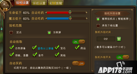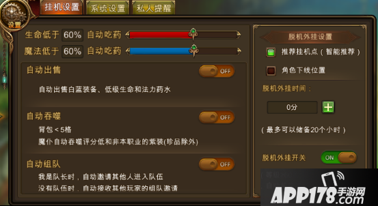 1.大于60级的玩家下线前可以打开“挂机设置”面板进行离线挂机的设置。您可以设置角色自动吃药与自动买药,让您在挂机过程中安全无虞;您还可以开启自动拾取,这样就不会错过挂机时掉落的好装备啦;当然,您还可以设置自动出售与自动吞噬,不用担心因为背包满了而无法拾取呦;最后,您还可以开启自动组队,大大滴提高挂机效率!
