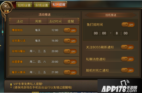 3、私人提醒共分成两大块内容:活动推送和挂机推送。其中,活动推送主要是日常的限时活动推送,包括鹰眼挑战、全民真心话等;而挂机推送主要是boss的刷新、私聊消息以及离线挂机死亡等。有时为了避免睡觉的时候受到打扰,玩家可以设置免打扰的时间,非常方便。
