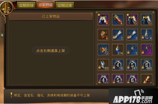 点开市场后,点击“上架物品”,选择需要出售的商品,然后填上想要出售的价格,再点击“上架”就可以出售了。