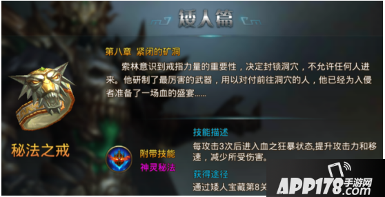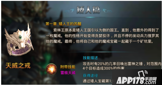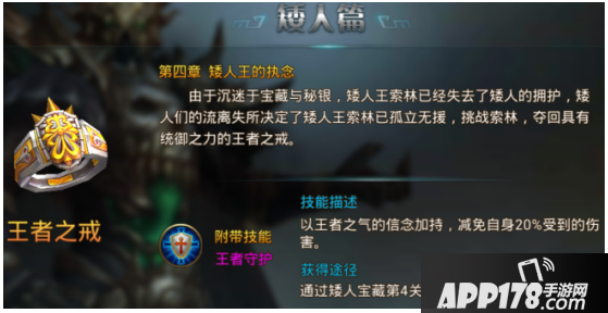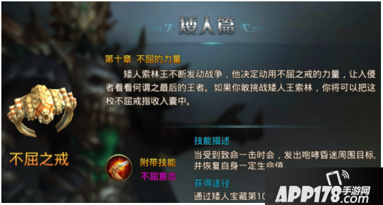 简介:矮人索林王不断发动战争,他决定动用不屈之戒的力量,让入侵者看看何谓之最后的王者。如果你敢挑战矮人王索林,你将可以把这枚不屈戒指收入囊中。